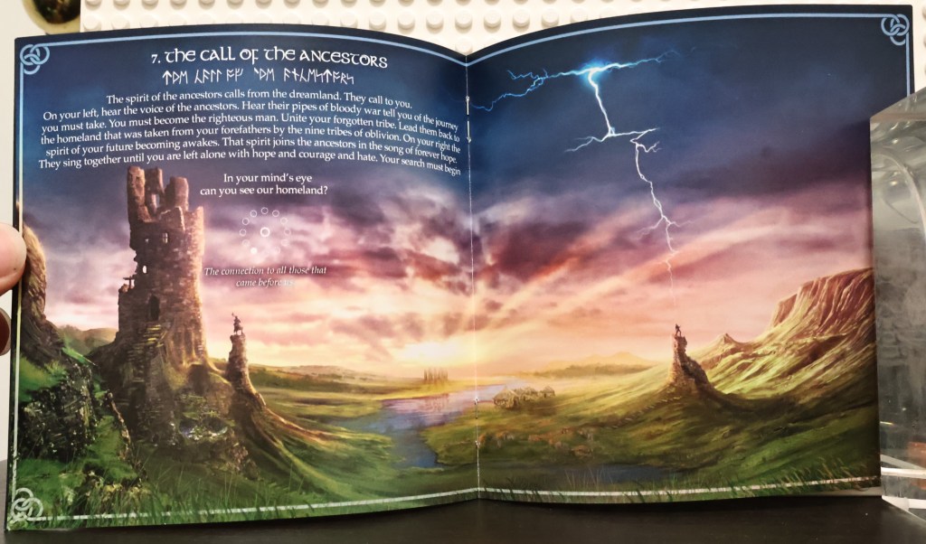 [Note 1] Curiously, the liner notes also state that Stalvind returns on “Absence” for additional vocals, but I can’t actually hear him on the song. I think it’s a typo because it only credits him for appearing on songs 7 (the instrumental “Call of the Ancestors”) and 9 (“Absence”), but not 8 (“Circle of Stone”, which he definitely sings on). I think it’s possible that the liner notes were written at a point when “Call of the Ancestors” and “Circle of Stone” were all together in track, because I think I hear Stalvind’s voice backing the chorus to song 10 (“A Day of Reckoning”, but also song 9 if “Ancestors” and “Circle” were combined). [Resume Reading]